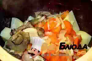 3. Разложить слоями в глиняные горшочки - картофель, пассерованные овощи, грибы.