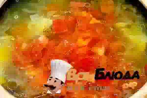 6. Накрыть горшки крышками и поставить в духовку. Похлёбка должна не кипеть, а медленно томиться. Минут через 30 добавить мелко нарезанные помидоры. И оставить томиться ещё полчаса.