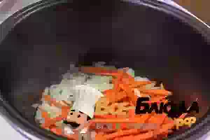 3. Включить мультиварку на режим «Жарка». Налить в чашу мультиварки растительное масло, разогреть и пересыпать туда лук. Обжаривать, помешивая, около 3 минут, после чего добавить морковь. Всё обжаривать до золотистого цвета и не забывать мешать лопаткой.