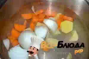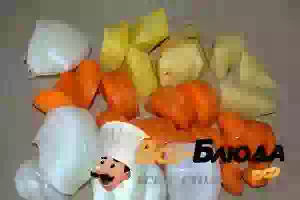 2. Налить воду в кастрюлю. Нарезать крупно очищенные и промытые картошку, морковку и лук.