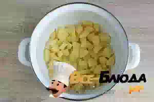 2. Картофель нарежьте небольшими кусочками и выложите в кастрюлю.