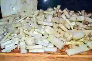 1. Количество продуктов ровно как в рецепте. Рыба у меня - щука. Отварила в 2,5 литрах воды (посолила), убрала косточки, порезала на кусочки.