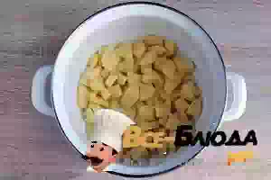 1. Картофель нарежьте небольшими кусочками и выложите в кастрюлю.