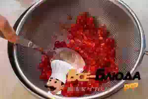 6. Откинуть ягоды на металлическое сито (воду слить) и перетереть пестиком, чтобы косточки и кожура остались в сите, а в миске под ситом - ягодное пюре.