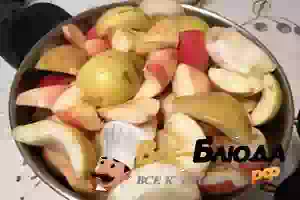 3. Половинки груш и яблок нарезать небольшими дольками толщиной около 5 мм. Переложить нарезанные фрукты в посуду для варки варенья. Засыпать их сахаром, перемешать и отставить на несколько часов, чтобы фрукты настоялись и дали сок.