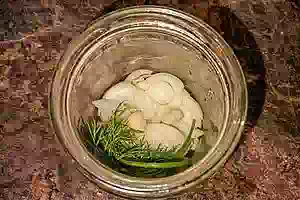 4. и выкладываем его на дно простерилизованной банки. Туда же отправляем нарезанный чеснок, промытый лавровый лист и свежий укроп