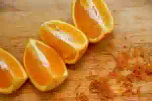 2. С апельсина снять цедру, после чего разрезать на дольки.