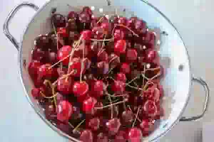 1. Вишню перебрать, выбросить подпорченные ягоды, веточки и листья. Промыть под проточной водой и откинуть на дуршлаг.