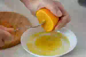5. Апельсин хорошо промыть под горячей водой. Можно слегка потереть щеткой. Насухо вытереть апельсин, теркой снять с него цедру и выдавить сок из апельсиновой мякоти.