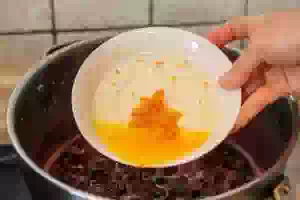 6. Добавить в варенье цедру вместе с апельсиновым соком, перемешать, на слабом огне снова довести вишневое варенье до кипения и проварить еще около 20 минут.