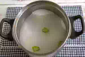 2. Половинку перца чили (без семян) нарезаем колечками и добавляем в кастрюлю с сахаром. Туда же наливаем воду и активно перемешиваем ингредиенты (до момента растворения кристаллов сахара).
