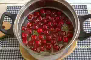 4. Высыпаем в сахарный сироп спелую, сочную вишню, предварительно промыв каждую ягодку под проточной водой и просушив на бумажных полотенцах.