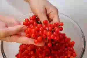 1. Калину собрать после первых заморозков и отделить от веток, перебрать, оставив только здоровые. Промыть ягоды в миске с водой и откинуть на дуршлаг. Дождаться, чтобы вода с ягод стекла почти полностью.