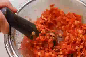 3. На глубокую миску поставить металлическое сито. В сито порциями перекладывать калину из кастрюли вместе с выделившимся соком. Протереть ягоды толкушкой для пюре или пестиком.