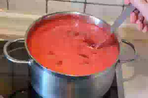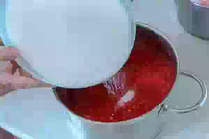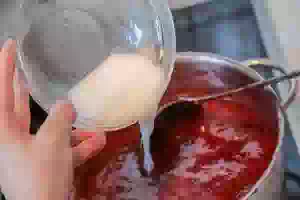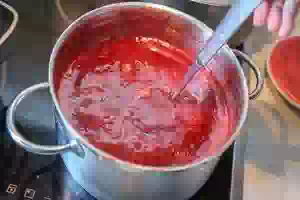 8. Перелить эту смесь в кастрюлю с повидлом из клубники. Размешать и варить около 10 минут на небольшом огне.