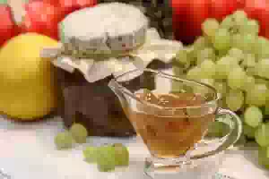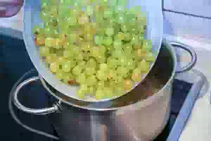 5. На следующий день вернуть кастрюлю с виноградным вареньем на плиту. Поставить на слабый огонь. Как только варенье закипит, влить свежевыжатый лимонный сок. Проварить еще примерно 10 минут. Проверить сироп готовность варенья просто: капнуть каплю варенья на блюдце, и если она не растекается, держит форму, значит варенье готово.