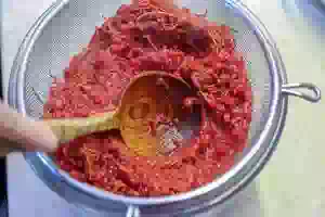 2. Перелить сироп через сито в другую посуду. Затем частями протирать размягченные ягоды ложкой через сито. Собранное пюре отправить в кастрюлю со смородиновым соком.