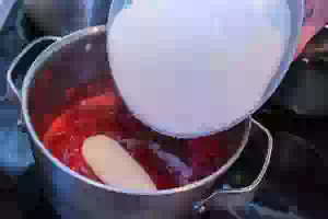 9. Залить горячим пюре из красной смородины и накрыть ошпаренными крышками.