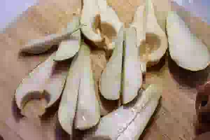 5. Груши разрезать пополам, удалит сердцевину, а затем каждую половину нарезать дольками (на 3-4 дольки каждую половинку).