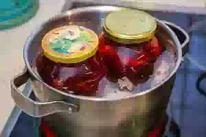 10. На дно кастрюли положить кухонное полотенце, залить горячую воду, установить банки. Вода должна доходить до горлышка банки. Стерилизовать банки с грушами в сиропе в течение 15-20 минут. Затем сразу герметично укупорить. Проверить герметичность банок, перевернув их вверх дном, прикрыть пледом или махровым полотенцем и оставить в таком положении до полного остывания. Груши в сиропе из красной смородины хранят в холодильнике или погребе.