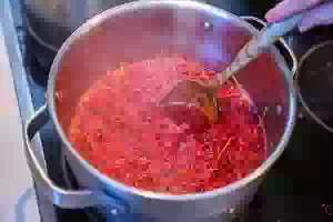 9. Залить горячим пюре из красной смородины и накрыть ошпаренными крышками.