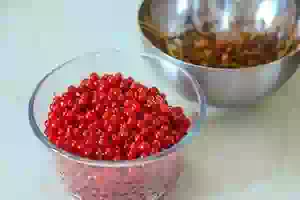 1. Красную смородину перебрать, удалить веточки, листья и промыть под проточной водой, откинуть на дуршлаг.