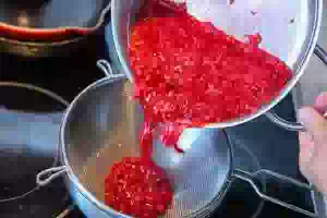 4. Над кастрюлей установить сито (можно дополнительно застелить марлей, так чтобы концы её свисали над кастрюлей), и вылить ягоды вместе с соком. Подождать, когда сок стечет. Если используете марлю, то приподнимая концы ткани, отжать смородиновый сок. Дать ему отстояться, чтобы он стал практически прозрачным, и перелить в чистую кастрюлю.