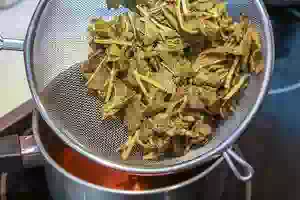 5. Слить отвар в другую кастрюлю или ковш. Обязательно измерьте объем получившегося отвара - у нас от 500 мл осталось ровно 300 мл.