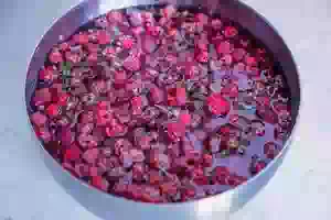 3. Посуду с малиной в сахаре поставить на слабый огонь, довести до кипения и, снимая пенку, варить 5 минут.