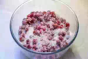 2. Ягоды засыпать половиной сахара и оставить 4 часа или на ночь. За это время малина даст сок.