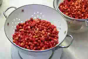 1. Землянику перебрать, выбрать лесной мусор, удалит гнилые ягоды. Ягоды аккуратно опустить в посуду с холодной водой, промыть и переложить на дуршлаг. Оставить землянику на 10~15 минут в дуршлаге, чтобы стекла вода.