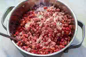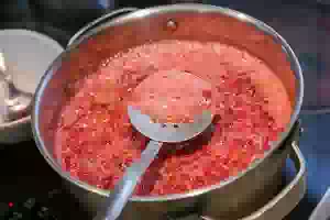4. Поставить кастрюлю с земляникой в сахаре на большой огонь. Когда варенье закипит, снять с него пену, и варить около 5 минут, помешивая. Осторожно! Варенье бурно кипит, может брызгаться. Снять кастрюлю с вареньем-пятиминуткой из лесной земляники с плиты.