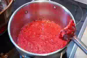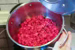 1. Малину перебрать, засыпать в кастрюлю и влить 1-2 ст.л. воды. Вода нужна только для того, чтобы ягоды быстрее дали сок, когда вы поставите кастрюлю на слабый огонь. Можно дополнительно придавить ягоды крышкой меньшего диаметра, чем дно кастрюли, и тогда сок появится еще быстрее. Как только увидите, что малина дала сок, можно снимать кастрюлю с плиты.