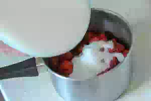 5. Проспиртованную клубнику переложить в посуду для варки варенья, засыпать сахаром.