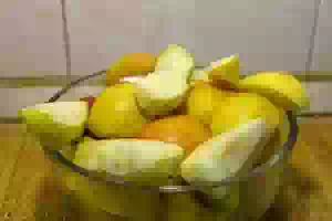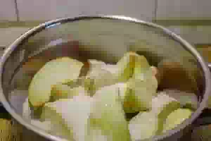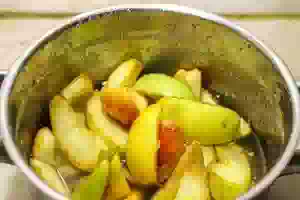 2. Удаляем плодоножки и семенную коробочку, нарезаем дольками. При варке меньше ломаются яблоки осенних сортов, поэтому лучше выбирать Антоновку, Семеренко, Анис. Но, в любом случае, яблоки должны быть одинаковыми по плотности.