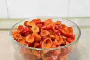 1. Плоды чистим в перчатках, так как жесткие волоски повреждают кожу и вызывают раздражение. У сухих ягод обрезаем чашелистики и стебельки. Разрезаем шиповник пополам и удаляем косточки и волоски.