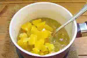6. Добавить в варенье очищенные от перегородок небольшие фрагменты апельсина. Держать на слабом огне еще 10 минут. При желании готовое варенье из ревеня с апельсином можно пюрировать все погружным блендером, тогда получится джем.