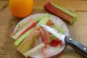 1. Подготовить все необходимое для варенья. Очистить стебли ревеня, снимая тонкую пленочку и счищая волокна.