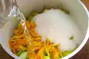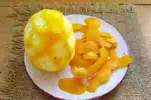 2. Апельсин помыть, опустить на полминуты в кипяток. Это удалит воск, которым часто обрабатывают фрукты, чтобы они лучше хранились. Острым ножом аккуратно срезать тонкий слой цедры, стараясь не задеть белую часть.