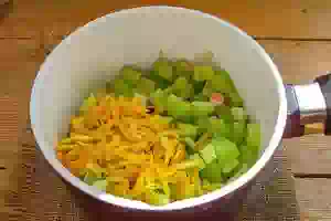 3. Нарезать очищенные стебли ревеня на небольшие кусочки. Выложить в кастрюлю вместе с измельченной цедрой.