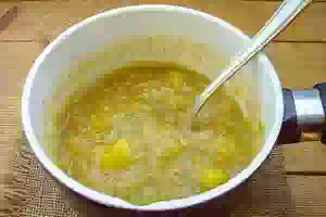 5. Влить холодную воду. Поставить на плиту. После закипания нагрев сделать ниже среднего, чтобы варенье из ревеня медленно булькало. Периодически помешивая, готовить 30 минут. Если увидите, что жидкости мало и содержимое кастрюли начинает пригорать, добавьте еще воды. В готовом варенье кусочков ревеня не должно быть видно, они практически полностью распадаются на волокна.