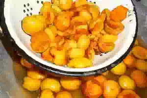 3. После того, как абрикосы дадут сок, аккуратно дуршлагом или шумовкой вынимаем абрикосы в отдельную посуду, а сироп ставим на плиту.