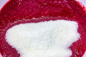 4. Затем добавляем в измельченную малину сахар.