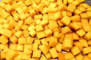 2. Очищенную от кожуры мякоть тыквы нарезать маленькими кубиками.