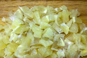3. Лимон помыть и снять верхний слой. Из мякоти удалить семена и нарезать средними кусочками.