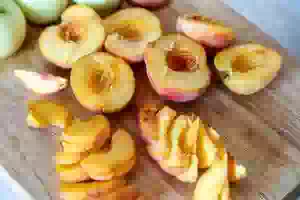 1. Сочные персики промыть под проточной водой, переложить на бумажное полотенце и дать фруктам обсохнуть. По желанию с персиков снять кожицу, как описано в этом рецепте, но делать это совсем не обязательно. Персики разрезать пополам, удалить косточки и каждую половинку порезать тонкими дольками.