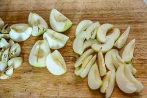 2. Яблоки вымыть, кожуру можно не очищать от кожуры, а приготовить вместе с ней, разрезать пополам, удалить семенную коробочку. Половинки яблок порезать так же, как и персики. Яблоки в варенье должны быть готовы одновременно с персиками.