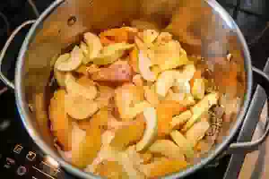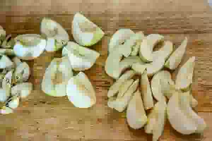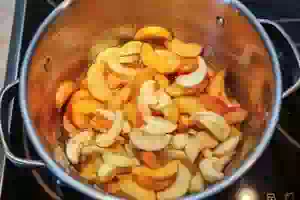 2. Яблоки вымыть, кожуру можно не очищать от кожуры, а приготовить вместе с ней, разрезать пополам, удалить семенную коробочку. Половинки яблок порезать так же, как и персики. Яблоки в варенье должны быть готовы одновременно с персиками.