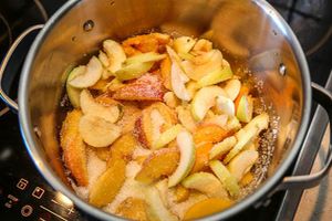 4. Оставить фрукты в сахаре хотя бы на 1 час, чтобы они пустили сок и при варке не пригорали. Затем поставить фрукты на слабый огонь, дождаться, когда фруктовый сок закипит и варить после запекания, часто помешивая, примерно 30 минут. Снять кастрюлю с вареньем с плиты и дать полностью остыть. Кстати, остывшее варенье можно измельчить погружным блендером, если захотите приготовить джем.