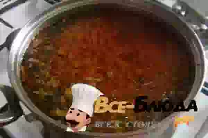 7. Затем добавить томатную пасту, хорошо перемешать. Добавить зажарку в кастрюлю.